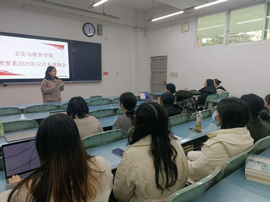 12月16日下午,文化与教育学院教育系在一教1103教室召开了2025年秋季学期12月教学工作会议。本次会议由文化与教育学院教育系副主任郭丹主持,教育系全体教师参加。