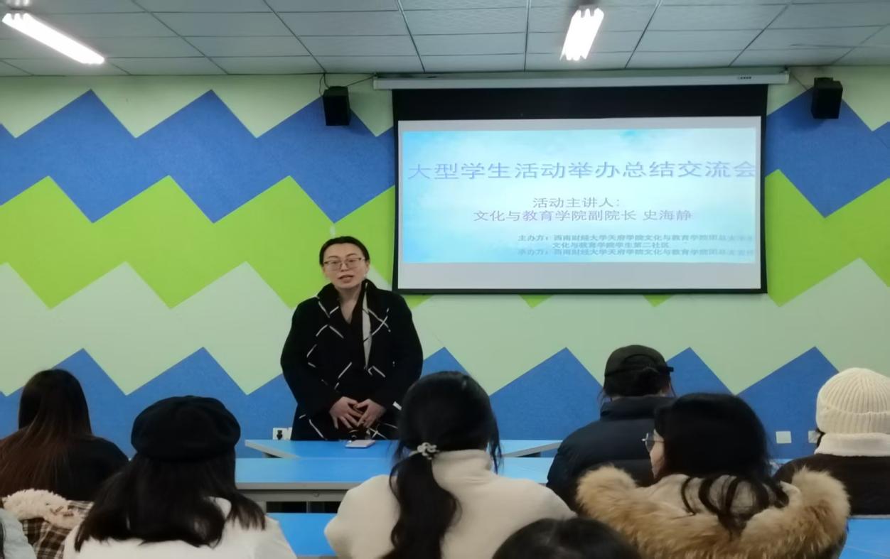 为切实提升学生骨干的活动策划与执行水平,助力其拓宽工作思路,夯实学院学生活动开展的人才基础,文化与教育学院团总支宣传部携手文化与教育学院学生第二社区,于12月30日在三教声乐室开展了2025年秋季学期第五期“面对面”座谈会之学生活动总结交流会,特邀文化与教育学院副院长史海静担任主讲嘉宾,文化与教育学院学生梁文静担任主持,共37名同学参加。