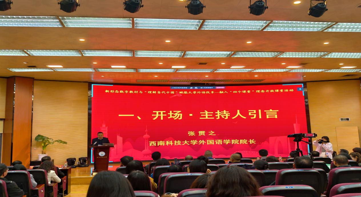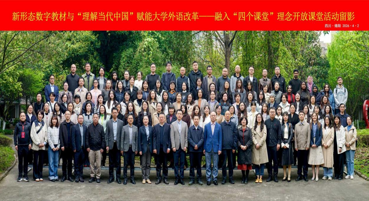 为深入贯彻国家“十五五”教育规划关于教育数字化转型的战略部署,扎实推进“三进”工作与课程思政建设,4月2日,由西南科技大学外国语学院主办,外语教学与研究出版社、四川省本科高校外国语言文学类教学指导委员会及四川省高等教育学会高校外语专业委员会共同协办的“新形态数字教材与‘理解当代中国’赋能大学外语改革——融入‘四个课堂’理念开放课堂活动”在西南科技大学举行。西财天府学院文化与教育学院应用语言学中心负责人郭家宏,公共外语系骨干教师蓝金燕、李梦婷应邀参会。