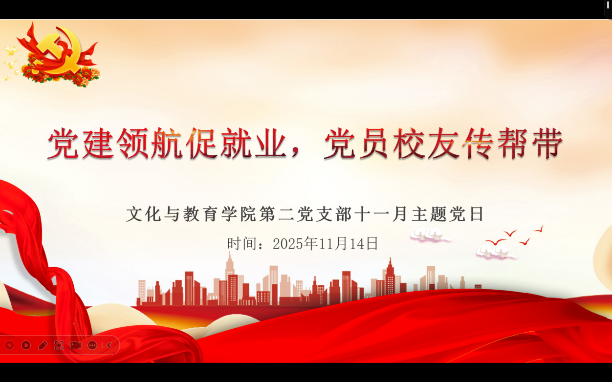 为深入贯彻党建引领就业工作要求,充分发挥党建领航、校友助力的桥梁纽带作用,文化与教育学院第二党支部于11月14日中午依托企业微信平台,开展了“党建领航促就业,党员校友传帮带”十一月主题党日活动。此次活动由邓俊坤主持,支部全体党员参与。