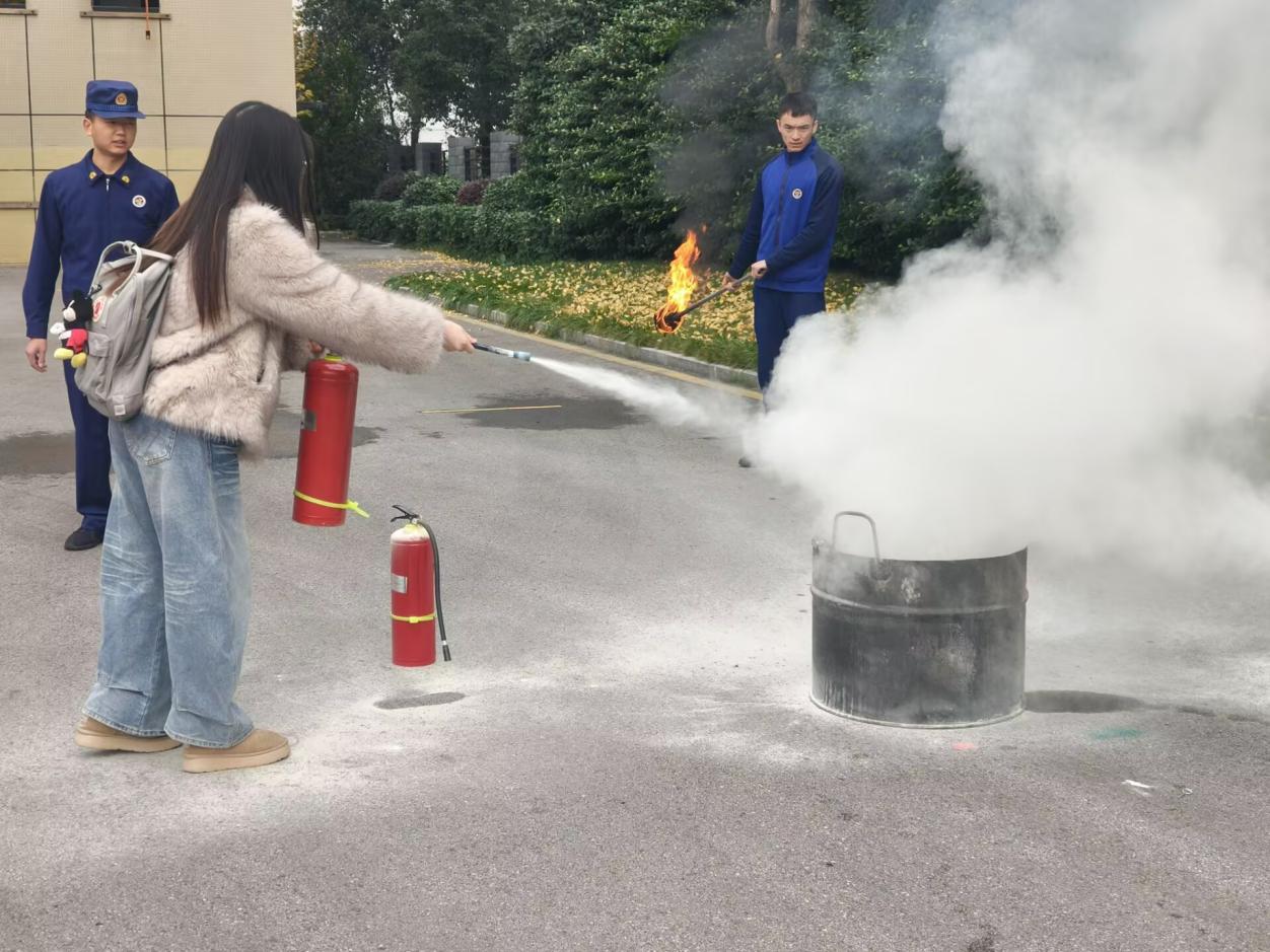 在灭火器演示实操环节,史小虎手持手提式干粉灭火器讲解其使用要点,并通过模拟火情进行实操示范,演示了“提、拔、握、压”的灭火步骤,同时他邀请了数位同学参与灭火器体验,让大家在动手操作中明白初期火灾的正确处置方法,掌握了灭火器的规范使用技能,深化了对消防安全“防患未然、科学处置”的认知。参观结束后,穆长霞代表文化与教育学院向消防人员献上锦旗并表达感谢,随后,消防人员与参与者一起合影留念。