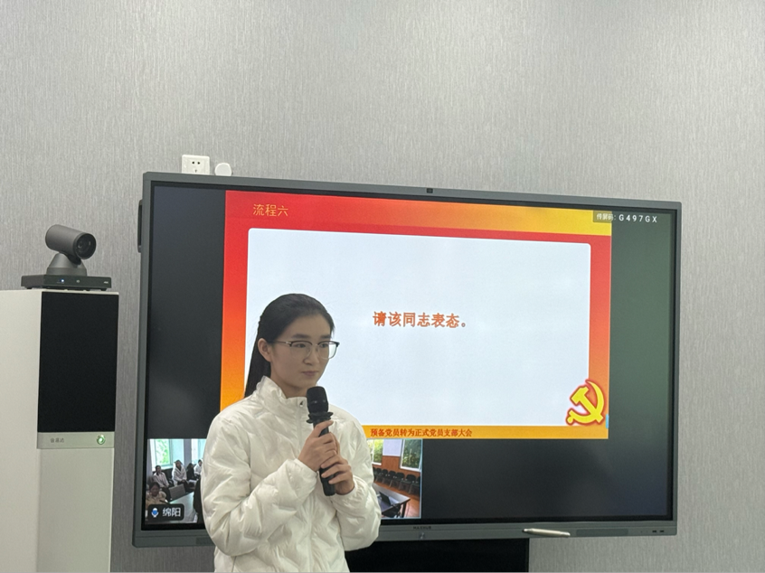 会议伊始,蒋海睿明确了大会的主要议程。会议中,各预备党员围绕在预备考察期间的思想政治、学习、工作、生活等情况依次进行了汇报,对自身存在的不足提出了加强改进的措施,提出了转正申请,并表示在未来的生活中,将继续以党的要求为指引,持续提升自身素质,贡献更多力量。随后,入党介绍人吴婷等同志详细介绍了十四位预备党员在预备期间的表现,田纵等支部党员分别对其是否符合党员条件发表意见,并通过无记名投票的方式进行表决,最终宣读投票结果。最后,全体与会人员面向党旗宣誓,会议圆满结束。