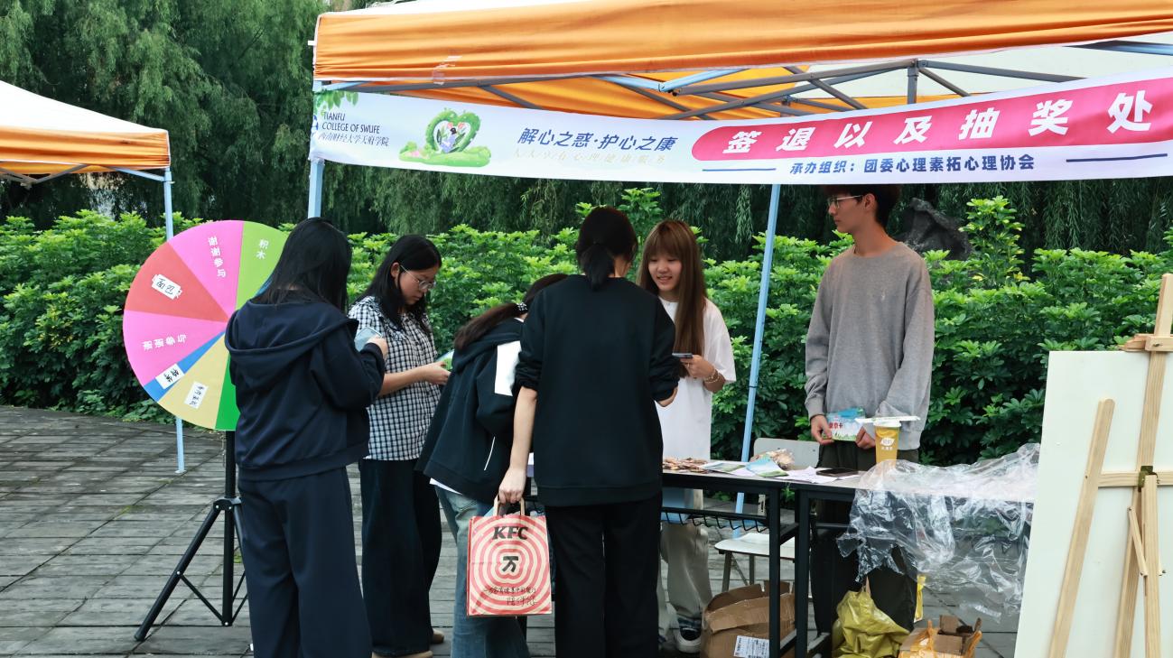 当同学们完成7个点位完整的身心互动体验后,在签退处出示集齐5枚学院印章的集章卡,由点位工作人员拍照留存卡面,并引导同学参与转盘抽奖,中奖者可领取纪念奖品。