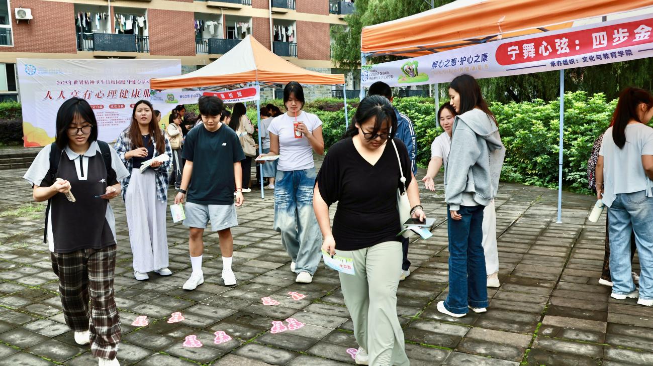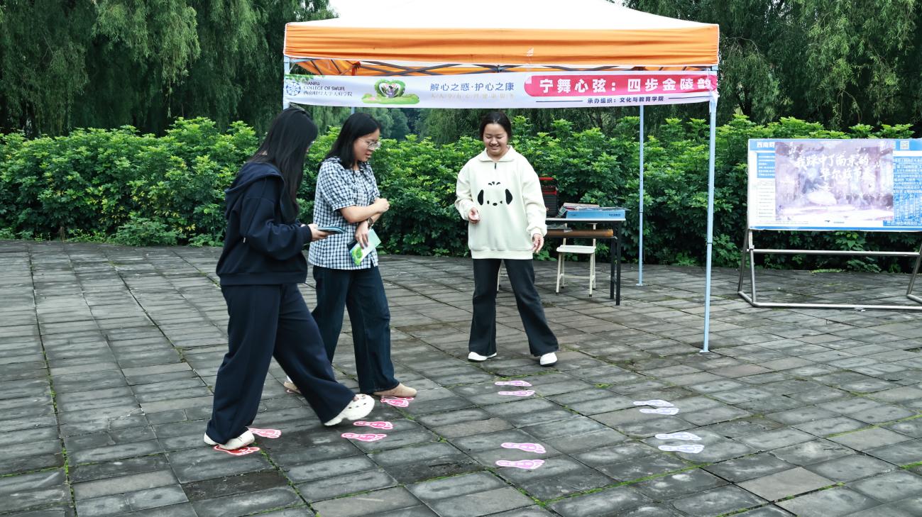 10月10日,适逢第34个世界精神卫生日,西南财经大学天府学院心理健康教育中心联合团委心理素质拓展中心、心理协会,在绵阳校区翠湖广场共同举办了“解心之惑·护心之康”主题游园会,活动吸引了1598人次踊跃参与。其中的由文化与教育学院辅导员穆长霞老师精心指导的“美育”主题活动点位——“宁舞心弦:四步金陵韵”,为现场环节带来了最为沉浸式的音乐熏陶及心灵疗愈互动体验。