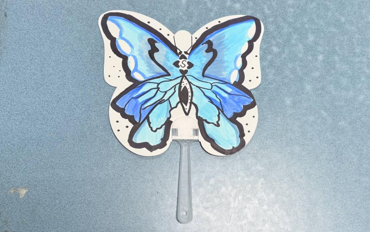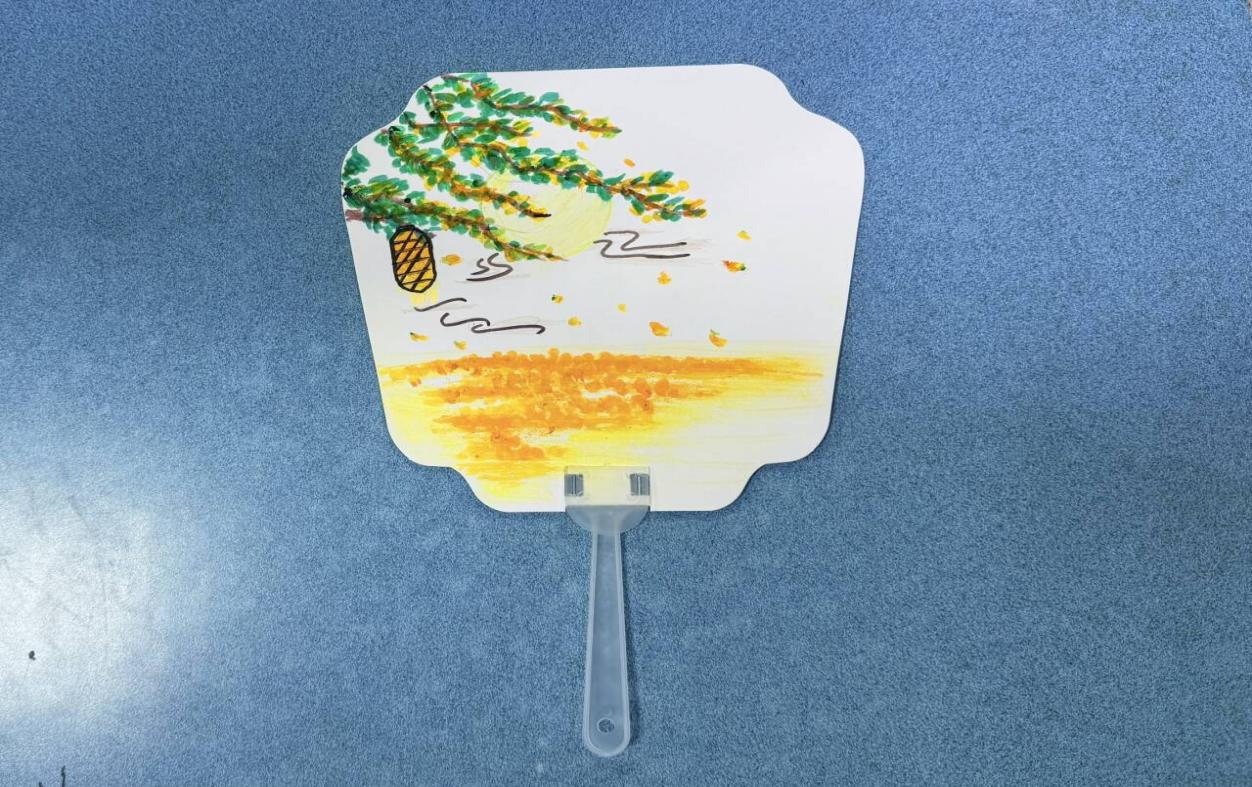 活动开始,由工作人员计时,参与同学在规定时间内完成绘画。其中,文化与教育学院学生杨苓苓同学的绘画作品呈现了以渐变蓝为主色调,层次柔和且富有光泽感,黑边勾勒让造型更灵动精致,点缀的黑点增添细节巧思,整体风格清新又兼具设计感,既贴合扇面载体的轻盈气质,也展现出创作者细腻的色彩把控力与创意巧思。王楚文同学的绘画作品:扇面画意境清新,暖黄渐变铺就柔和底色,垂柳自带诗意,飘落的碎金点缀更添灵动。笔触虽简,却将秋日元气氛围精准勾勒,既贴合扇面的轻盈质感,也显露出创作者细腻的生活感知力。最后,杨璐老师对同学们的作品进行了点评,对同学们的巧妙构思、细腻手法予以了充分肯定,同时引导同学们加深对“扇面绘梦,笔韵生花”主题的理解。