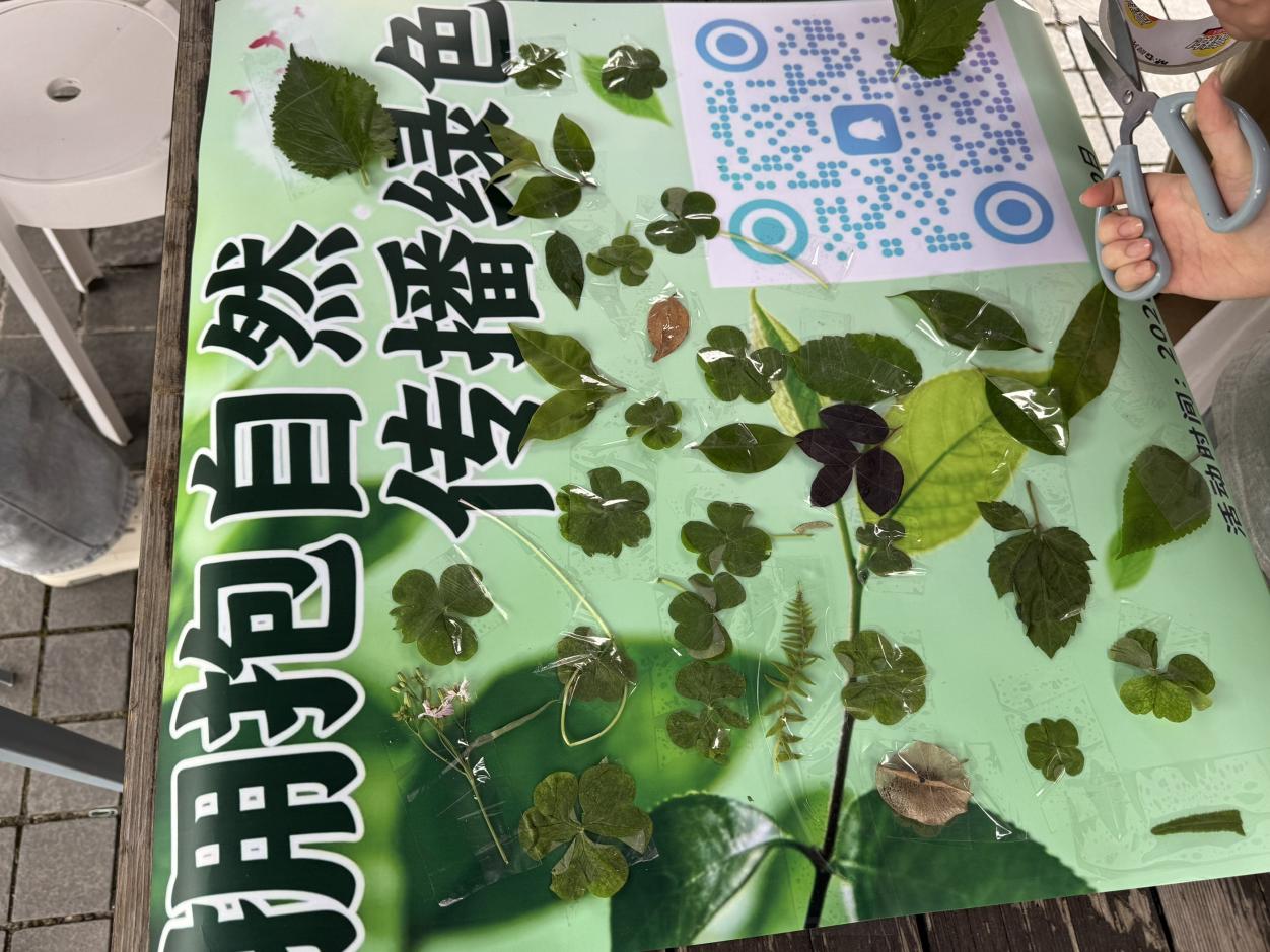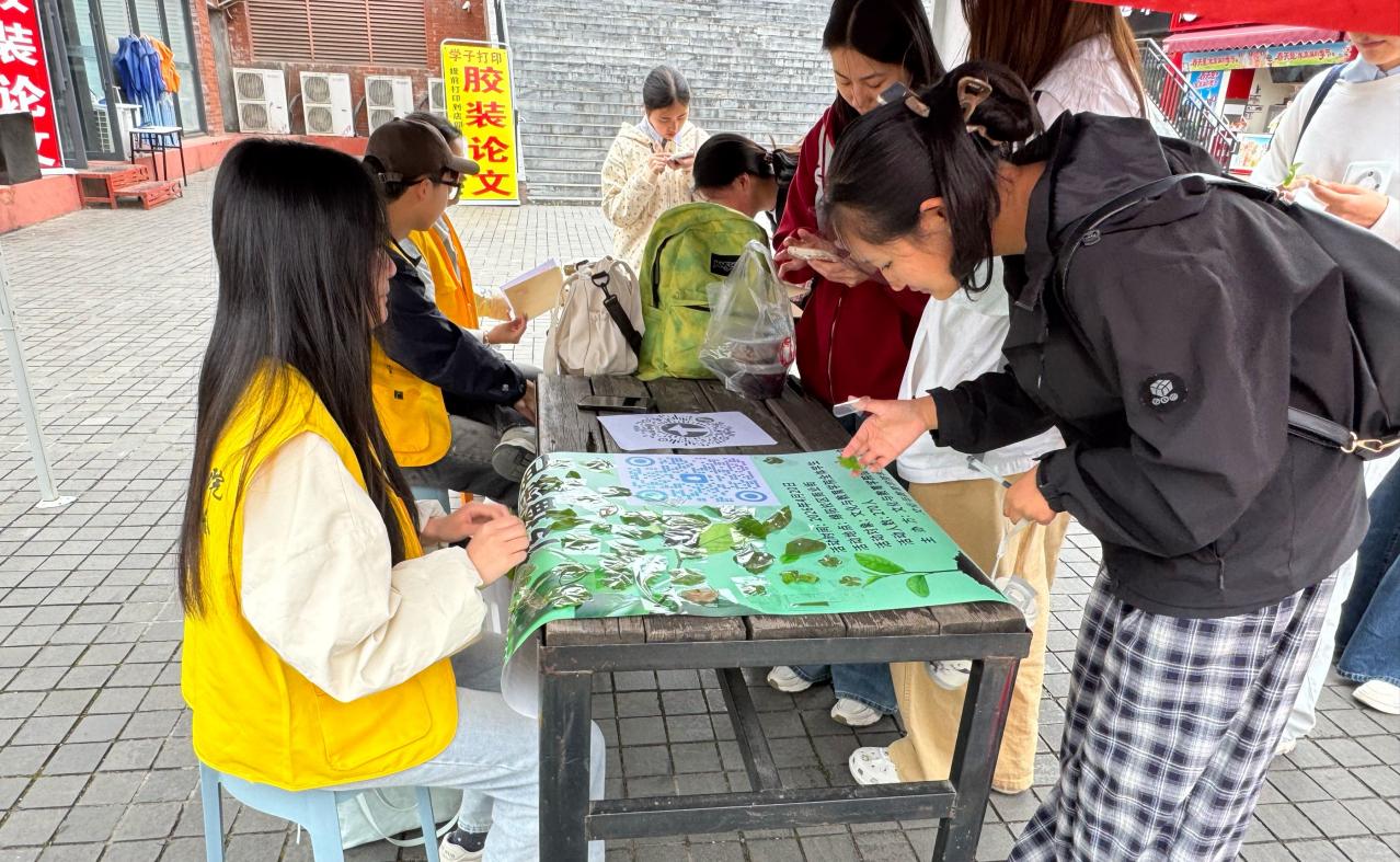 参与学生按秩序到达商业街活动现场,领取材料后,在指定区域将收集的树叶进行创意张贴,共同打造绿色主题展示墙。同学们发挥巧思,将形态各异的树叶、花草标本搭配文字贴纸,拼贴出春日风景、绿植图案与环保标语,原本普通的墙面在大家的创作下,变成了一面充满生机与巧思的自然艺术墙。同学们纷纷与充满生机的树叶主题展示墙打卡合影,用镜头定格下春日里亲近自然、传递绿意的温暖瞬间。不少同学表示,这样的活动形式新颖又温暖,让大家在轻松的氛围里释放压力,真切感受到自然风光与集体创作的乐趣,也在亲手创作中更深刻地体会到保护自然、践行绿色生活的意义。