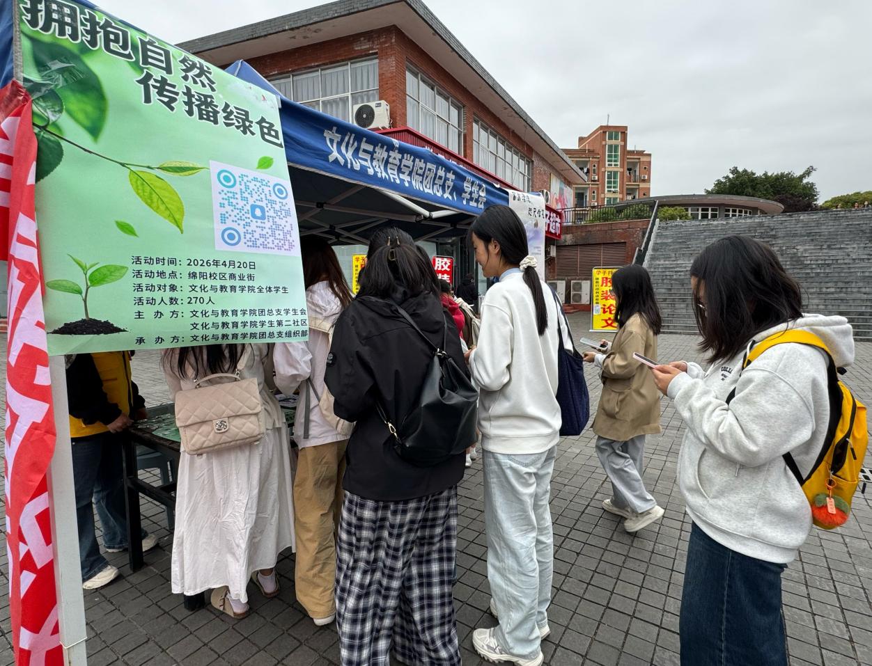为帮助学院学生在春日校园中亲近自然,感受自然之美,增强环保意识与生态责任感,文化与教育学院团总支组织部携手绵阳校区第二学生社区于4月20日在商业街开展了面向文化与教育学院全体学生的“拥抱自然,传播绿色”的主题活动。本次活动共吸引了270名同学参与。