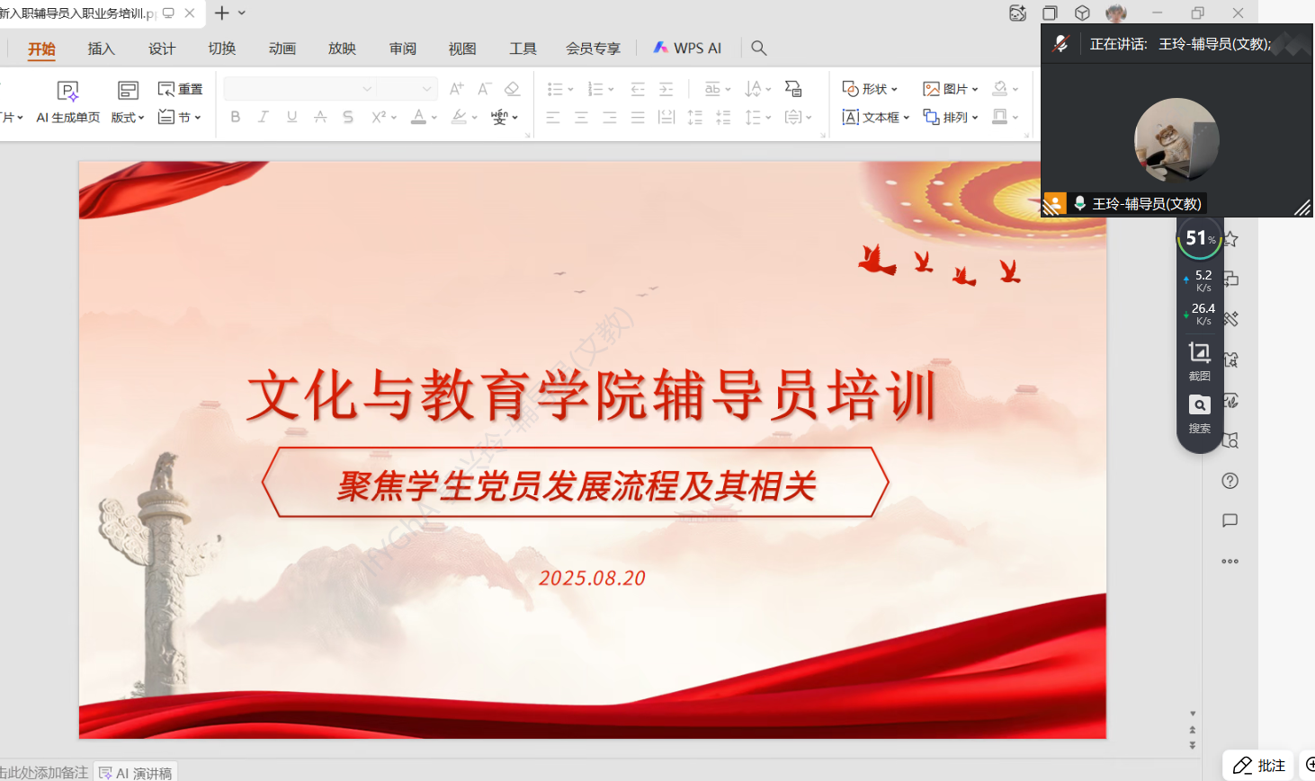 为夯实基层党务基础,提升新入职辅导员履职能力,8月20日下午,文化与教育学院组织开展了暑期辅导员师资队伍能力提升之学生党员发展与培养工作专题培训会。本次培训由学院第一党支部书记王玲主持,入职不满两年的辅导员参加。培训伊始,王玲首先阐述了培训背景与目标,清晰界定了辅导员的工作职责,帮助新入职辅导员树立正确的角色认知。她指出,辅导员...