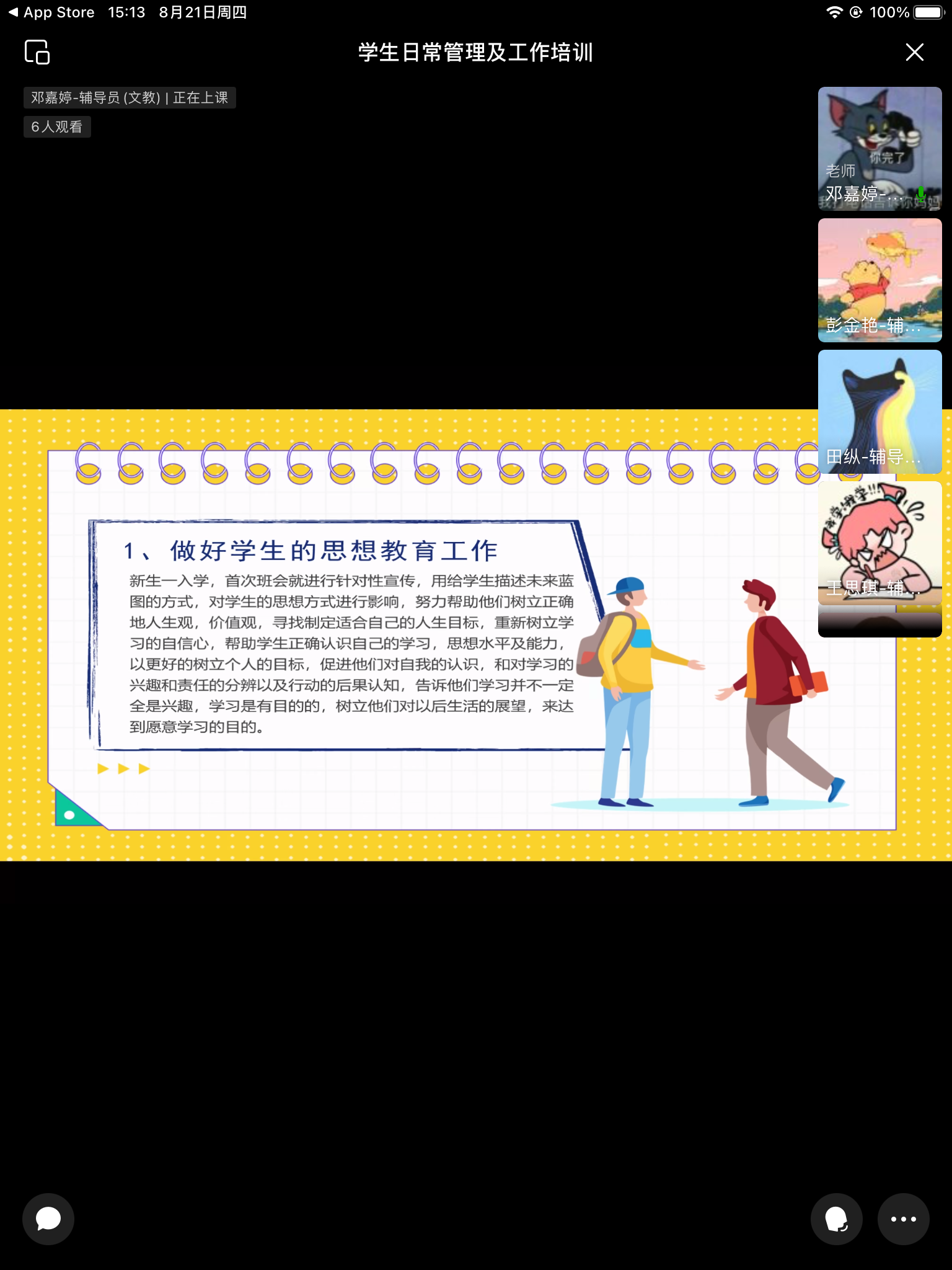为切实做好新学期学生安全管理工作,提升新进辅导员的学生管理水平,8月21日下午,文化与教育学院组织开展了暑期辅导员师资队伍能力提升之学生日常管理工作专题培训会。本次培训由邓嘉婷主持,入职不满两年的辅导员参加。会议开始,邓嘉婷首先强调了辅导员在日常工作中及时知晓学生去向的重要性。她结合学生管理工作经验,举例介绍了如何通过多种渠道准...